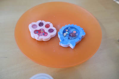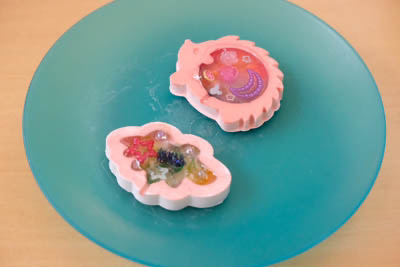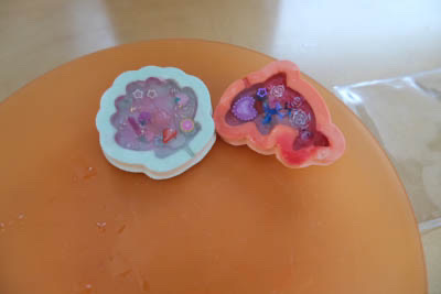 11月25日、中央図書館でまちじゅう図書館のワークショップをしました。今回作成したのは「デラックスカプセルデコ・クリアチャームバージョン」。石膏の上にレジンをのせ、カラフルで透明感のあるチャームを作りました。
