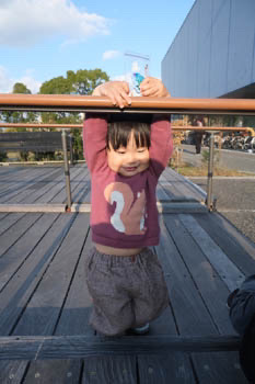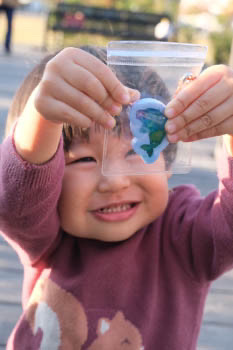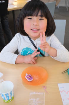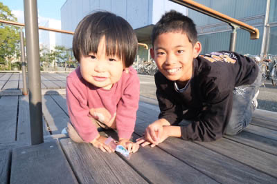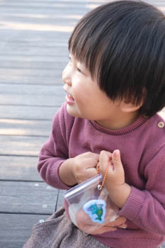 そして、この日はとてもいい天気で外がぽかぽかだったので、ワークショップを終えた後、外のテラスで休憩をしていると2歳の男の子が「お弁当食べる?」と話しかけてきてくれました。お弁当はもっていないので、作ったばかりのチャームをあげると、とても喜んでくれ、写真を撮らせてくれました。夕暮れのひととき、癒しの時間をいただきました。